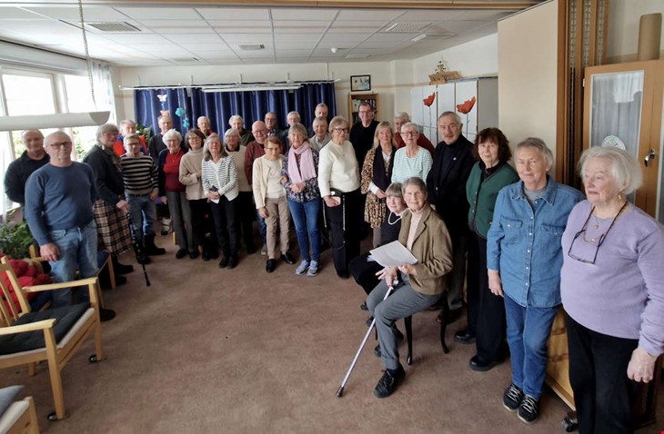äldre som samlats i den gamla matsalen på Kyvikshus